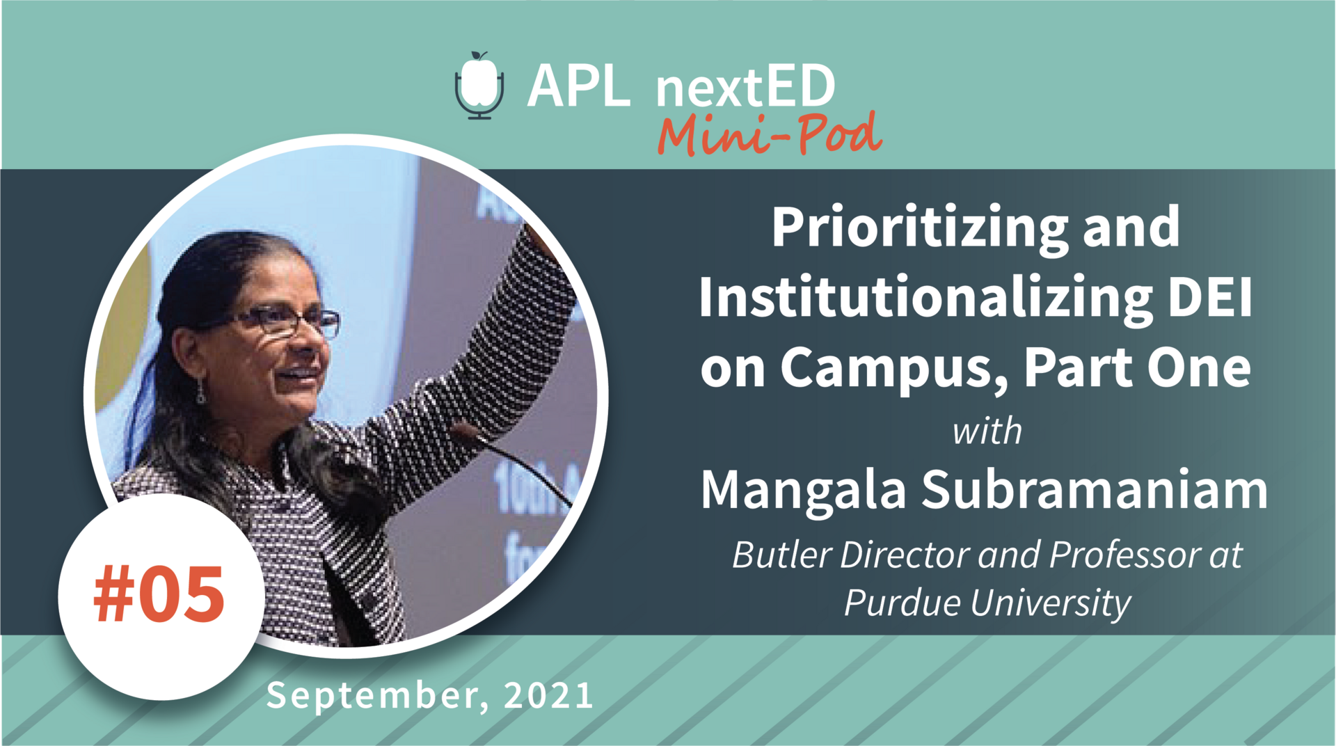This week on the APL nextED Mini-Pod, Dr. Mangala Subramaniam, Butler Chair and Director at Purdue University, shares her experiences as a professor and administrator advocating and supporting diversity, equity and inclusion initiatives for faculty, staff, and students in part one of this two-part episode.